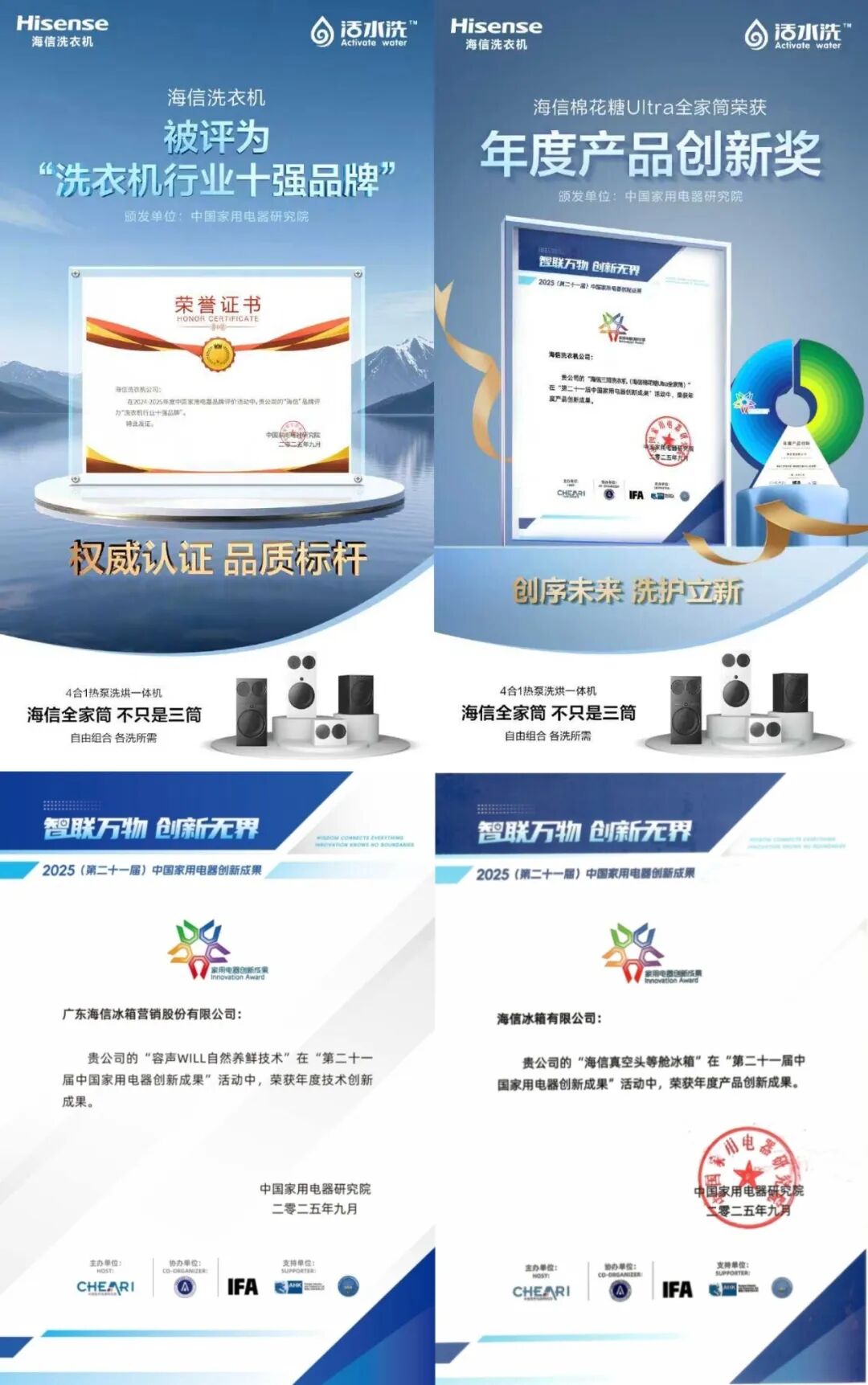 海信家电多个产线荣获中国家用电器创新成果推介大奖(点击查看) ]article_adlist-->9月5日,中国家用电器研究院主办的“第二十一届中国家用电器创新成果推介”活动举行。海信棉花糖Ultra全家筒获“年度产品创新奖”,同时海信洗衣机被评为“洗衣机行业十强品牌”;容声冰箱凭借WILL自然养鲜技术的优秀表现,摘得“年度技术创新成果”奖;海信璀璨真空头等舱冰箱以真空磁场保鲜技术定义储鲜新标准,荣获“年度产品创新成果”奖。