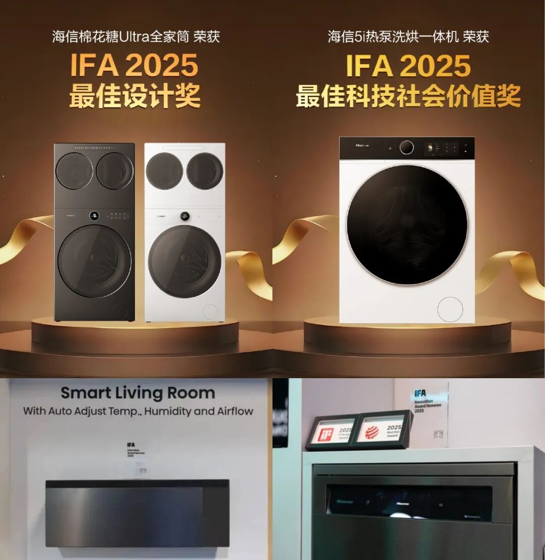备受瞩目的IFA Innovation Awards评选中,海信棉花糖Ultra全家筒首次亮相IFA展,荣获“最佳设计奖”,海信5i热泵洗烘一体机凭借出色节能表现,荣获“最佳科技社会价值”奖;海信空调S Pro以“AI空气智能体”为创新理念,荣获IFA创新奖;搭载AI智能洗涤技术与人体工学设计的海信零菌洗碗机荣获IFA 2025“最佳设计奖”。